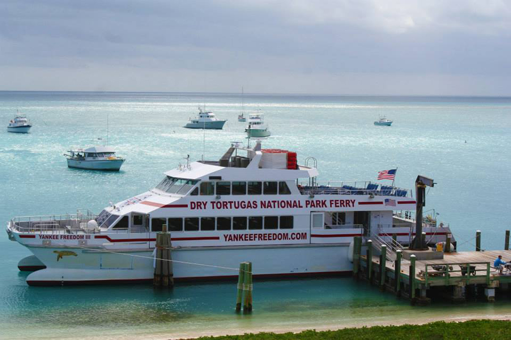 Cruise in spacious comfort to Fort Jefferson in the Dry Tortugas National Park aboard the Yankee Freedom III, a high-speed ocean-going catamaran specifically designed for carrying passengers safely across the 70 miles of open water from Key West to the Park. The Yankee Freedom III is 110’ long and 30.6’ wide, a broad and stable vessel certified to carry 250 passengers; however, to maximize the comfort of each guest, we limit each tour at 175 passengers. Our veteran captain and friendly crew will take you on a day trip to one of the most unique and spectacular national parks in the United States: The Dry Tortugas National Park and Fort Jefferson. Almost 70 miles west of Key West, nestled among coral reefs, and white sandy beaches, lie seven remote islands called the Dry Tortugas. Unforgettable adventures await you on this most memorable Key West tour. En route to Dry Tortugas National Park our onboard naturalist will give you an orientation about the area and the national park’s surroundings. During your voyage, you will enjoy the beautiful scenery of the Marquesa Islands, Boca Grande, have an opportunity to see turtles and dolphins, and listen to pirate legends. You can travel inside the upper or lower air-conditioned cabins or outside on one of our observation decks. The bow, or front, deck is tiered so you can get a full vista photo rather than the back of some stranger’s head! The Yankee Freedom III features comfortable padded sling seats that allow room for movement and easy access to the tables. There are four heads (bathrooms) and three fresh water rinses (with warm water!) that allow you to desalinize and change into dry clothing for the return to Key West. Bars on both decks stock a full compliment of beverages and the galley is open all day for extra snacks, souvenirs and essentials. The bars and the galley are both limited to cash or credit card sales. Rest assured, our award-winning crew will be there to make your adventure fun, comfortable and safe.